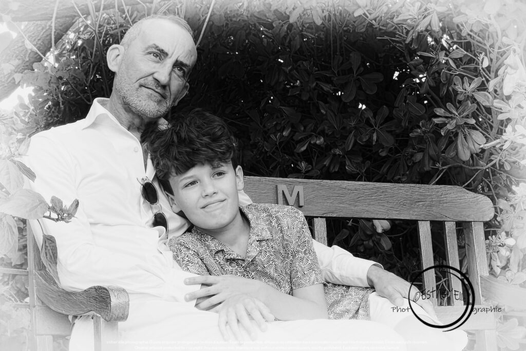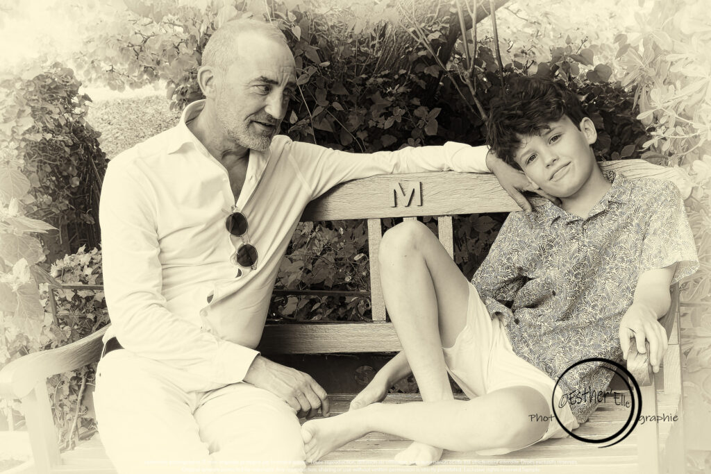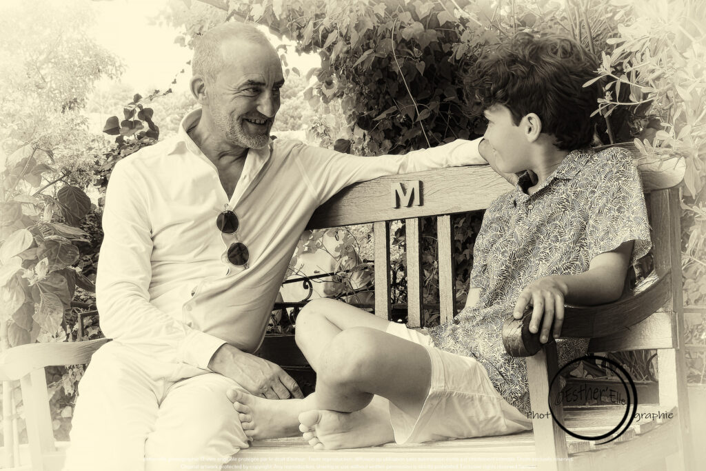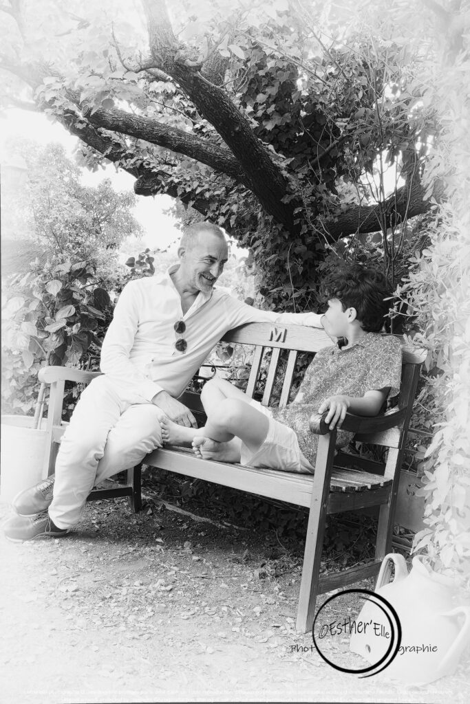 Chaque image parle d’amour, de confiance, de lien. L’enfant et l’adulte, réunis sur ce banc sculpté, partagent bien plus qu’un instant : ils partagent une histoire, une mémoire, une tendresse silencieuse. Le banc, justement, n’est pas là par hasard. Il est le témoin discret de cette communion intime. Il incarne la stabilité, l’accueil, la continuité. Il devient le socle sur lequel s’appuie l’émotion, le cadre dans lequel se dessine la relation.